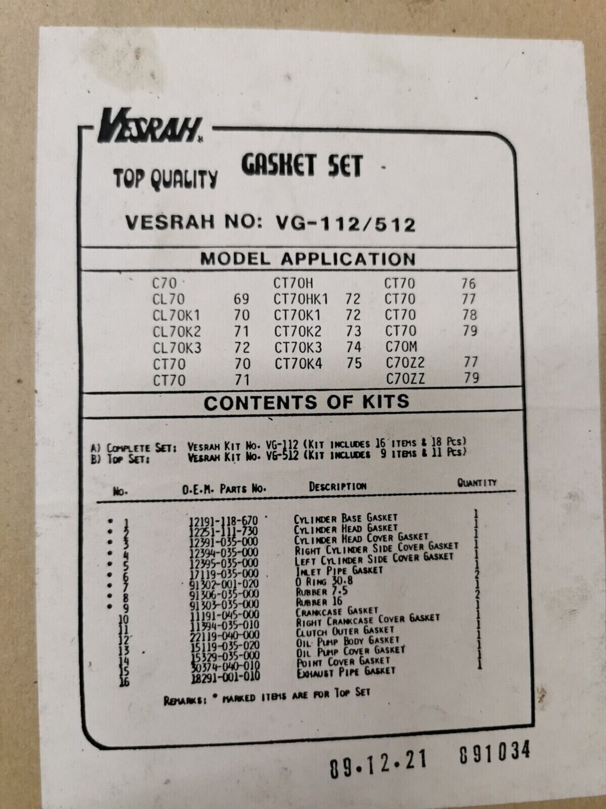 NOS VESRAH C70 CL70 1969 - 1979 INCOMPLETE GASKET KIT VG-112 /512 J46